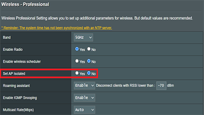 Select the No option for the Set AP Isolated setting.